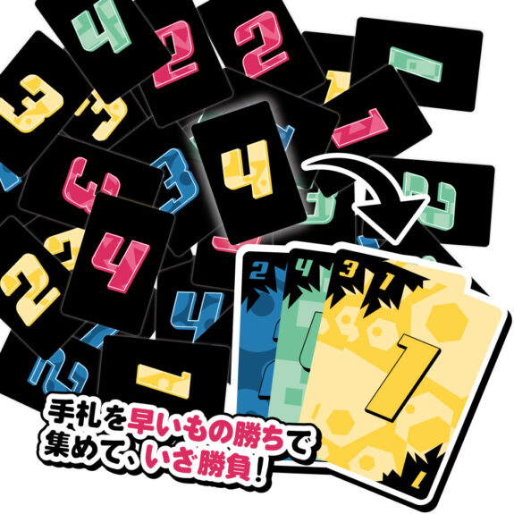 手札が用意できたら手番順に、直前に出されたカードと同じ色で、より大きな数字を出します。誰かが手札を使い切ったらその回は終了し、順位に応じた枚数のカードを伏せたまま選び──つまり正確な数字はわからないまま、得点として獲得します。3回戦終了時に、合計得点の最も高いプレイヤーが勝利します。